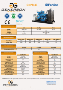 Le GENERSON GNPR 33 est un groupe électrogène diesel haute performance destiné aux applications professionnelles nécessitant une alimentation électrique stable et continue. Équipé d’un moteur Perkins 1103A-33G et d’un alternateur GENERSON, il délivre une puissance de 33 kVA en Standby et 30 kVA en régime Prime.